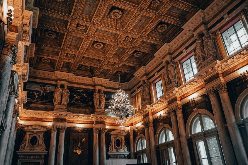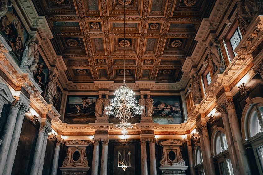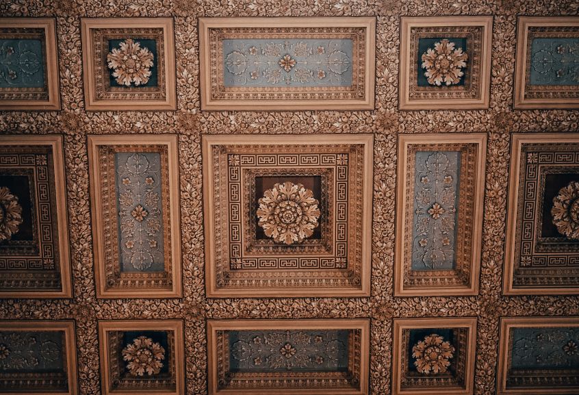 «В реставрации принято выделять неоригинальные элементы для будущих поколений реставраторов, чтобы те различали оригинальную и неоригинальную части. Под прямым освещением на столешнице можно увидеть эти вставки, такие же элементы мы выделили на стенах, потолках и прочем», – отмечают мастера.