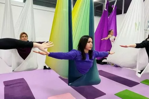 Киевская студия Takahamaka открывает набор в группу оздоровительных занятий по фитнесу в гамаках для военных.