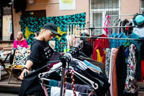 Очередная брахолка во дворике на Подоле. Цель сейлов в этом сезоне – собрать средства на дроны и другую технику для ВСУ. На этот раз акцент делают на продаже крутой одежды, аксессуаров и украшений.