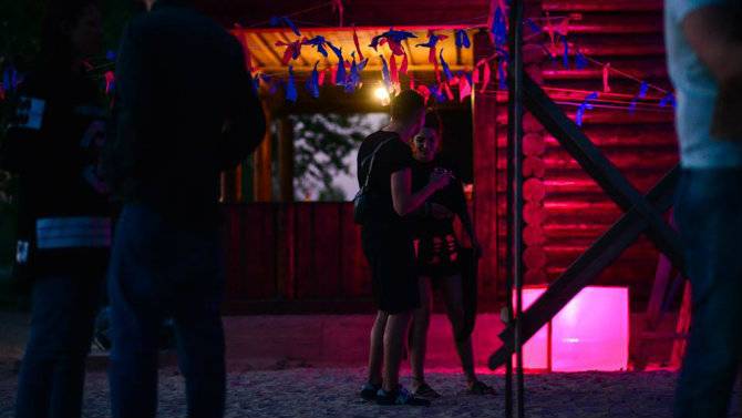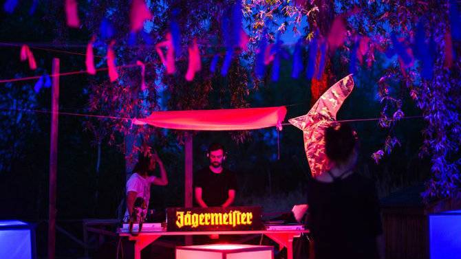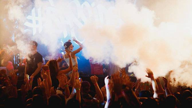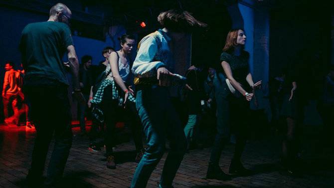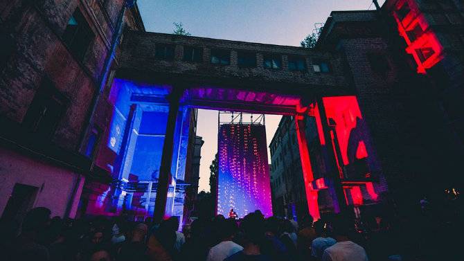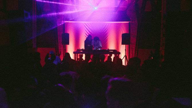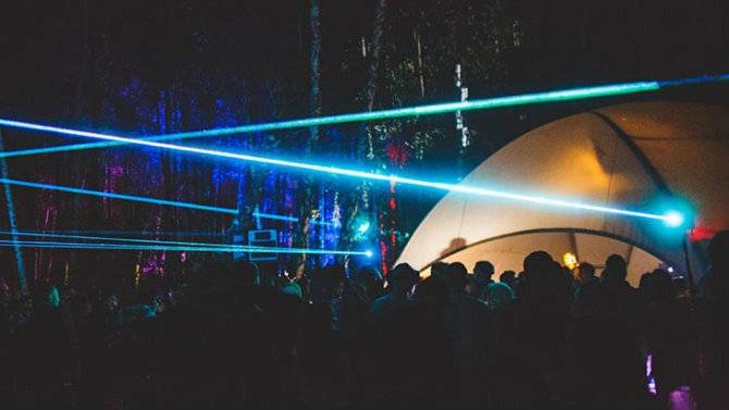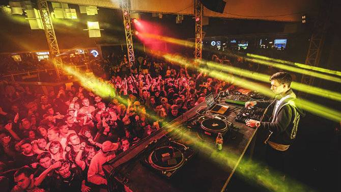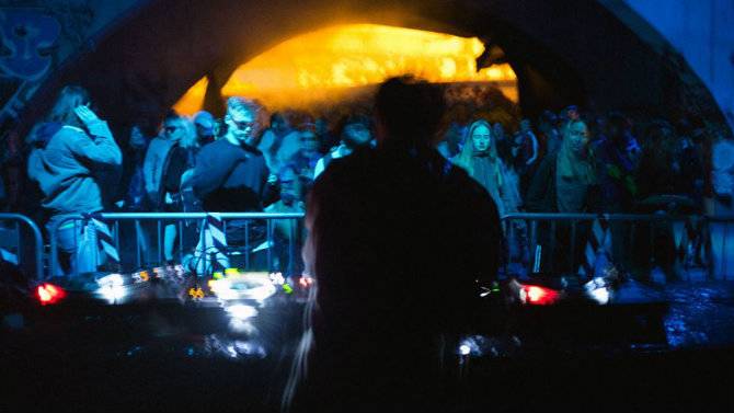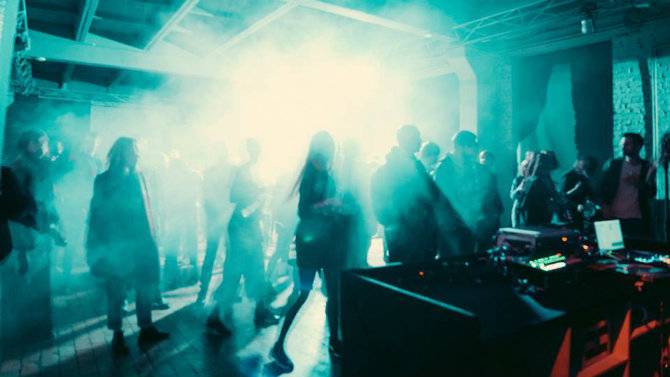 Играет техно, диджеи сменяются за пультами, люди танцуют. Кроме музыки, бывают еще световые инсталляции.