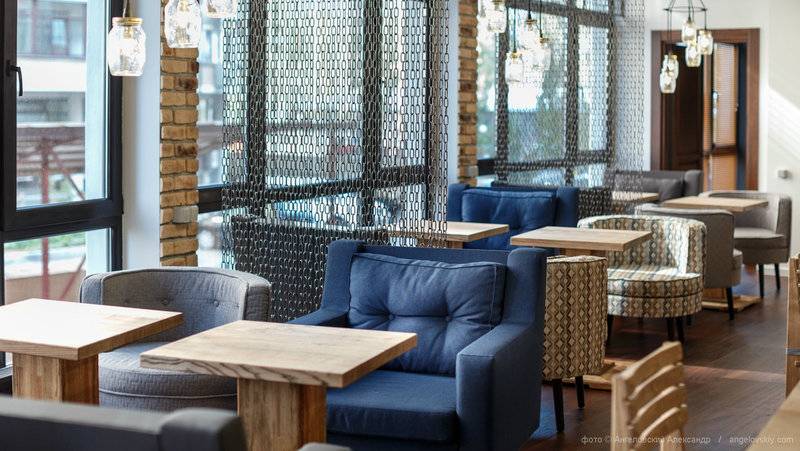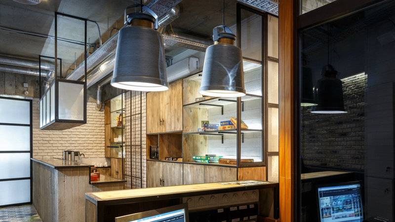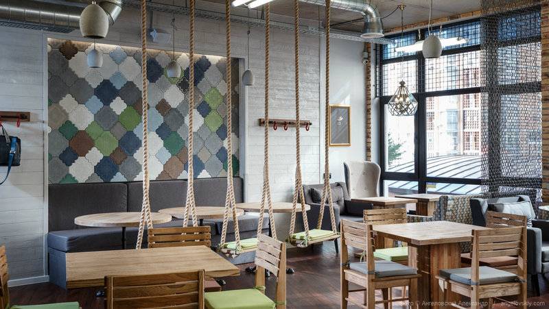 Интерьер в стиле лофт дополняют множество зеленых растений, деревянные столы, металлические конструкции, мешковина, удобные кресла, продуманное освещение.