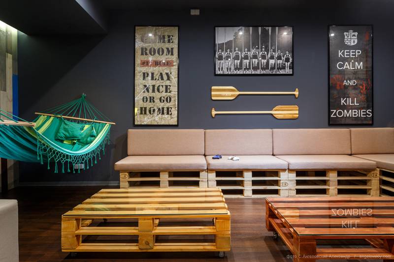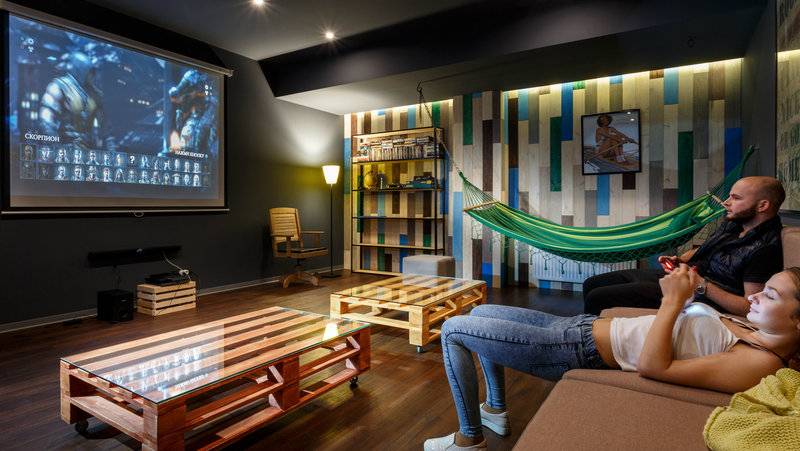 Пространство разделено на шесть залов. Тут есть библиотека на 15 человек с экраном и проектором для проведения презентаций, игровая комната с приставкой и настольными играми на 20-25 чел., покерная – на 15 чел., два кабинета на два человека с мощным компьютером.