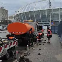 Фото. Возле НСК «Олимпийский» обустраивают антипарковочные столбики