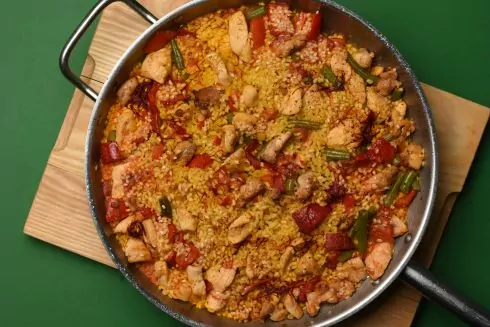 Важливий момент: паелью можна готувати з чим завгодно. З куркою, кроликом, рибою, морепродуктами або з усім цим разом. Головне зрозуміти логіку: спочатку на пательні обсмажуємо м'ясо, потім рибу, потім морепродукти, потім додаємо овочі, рис та все інше. Розбираємо, як це працює, на прикладі простої паельї з куркою.