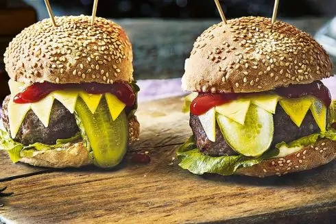 З гострими сирними “зубами”, “язичками” із солоних огірків та “очима” із фаршированих оливок — ці гамбургери-монстри ідеально підходять для тематичної вечірки на Гелловін.