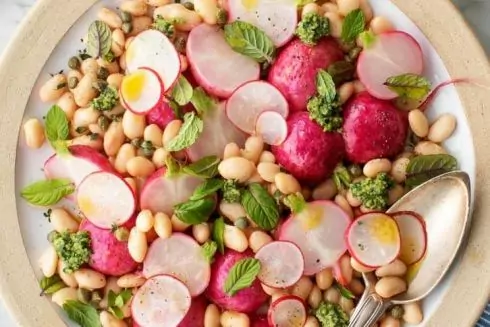 - Вкласти редиску та квасолю у велику миску, додати каперси, песто, листочки м'яти.
