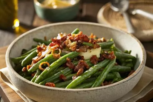 - Додати обсмажений бекон до квасолі, перемішати та прогріти ще 2–3 хвилини. Подавати квасолю одразу, поки гаряча.