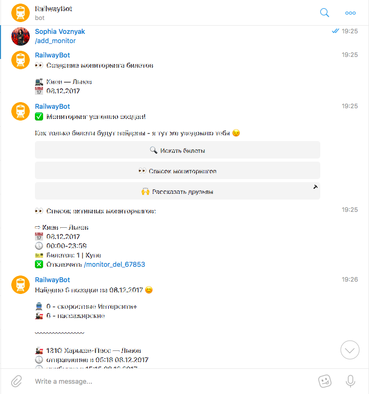 Цей бот уміє моніторити квитки, дізнаватися маршрут потяга за його номером і перевіряти наявність квитків у потрібне місто. І, треба сказати, справляється з цим відмінно.