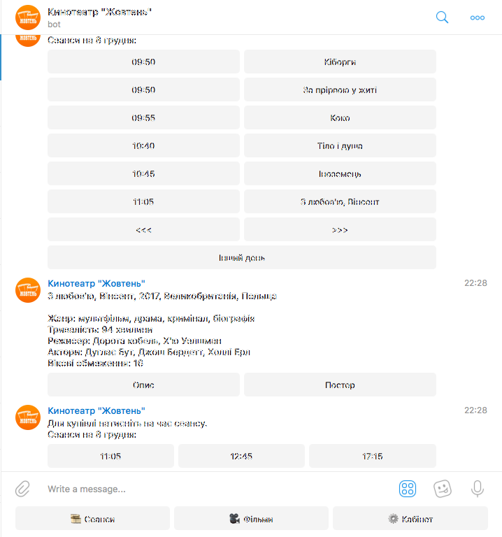 Київські кінотеатри «Жовтень» і «Оскар» (в ТЦ Dream Town і Gulliver) обзавелися власними ботами, які допомагають дізнатися розклад сеансів і відразу ж купити квитки. Кілька секунд, два кліки — і квитки ваші.