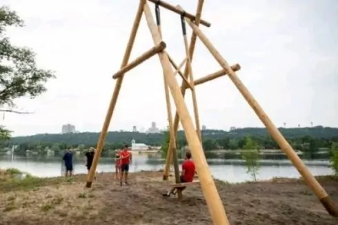 На Трухановому острові та Дніпровській набережній встановили велетенські дерев’яні гойдалки.