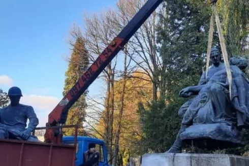 У Львові демонтували три радянські скульптури з «Пагорбу слави». Це «Мати-Батьківщина», «Воїн із прапором» та «Присяга».