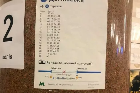 На станціях розмістили навігаційні таблички, де зазначено режим роботи синьої лінії метро, а також графік "човникового" руху поїздів.