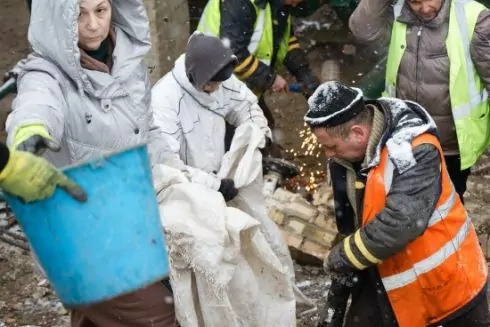 Небайдужі містяни розрізають фурнітуру на перевернутих смітниках, щоби закрити ними вибиті вікна; деблокують теплостанцію поруч із будинком; збирають габаритне сміття; підмітають підʼїзди та годують людей, що працюють.