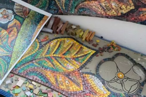 У Львові відновлюють мозаїку “Інформаційний простір” у будівлі видавництва “Вільна Україна” на вул. Володимира Великого, 2.