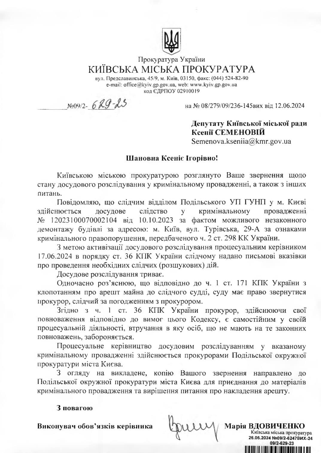 У Київській міській прокуратурі також відкрито кримінальне провадження щодо умисного незаконного руйнування лісопильні Сніжка 1902 року, що розташована на вулиці Турівській, 29-А.