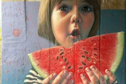 На стінописі Олександр Корбан зобразив свого сина Алана, що насолоджується скибкою кавуна.