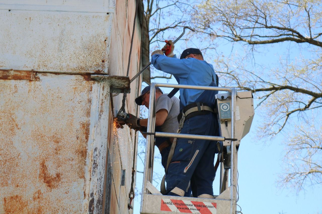 Демонтаж проводили у кілька етапів: спочатку верхні частини знімали вантажною технікою, а потім розбирали вручну. Підняти всю конструкцію одразу було неможливо через відсутність технічних зачепів.
