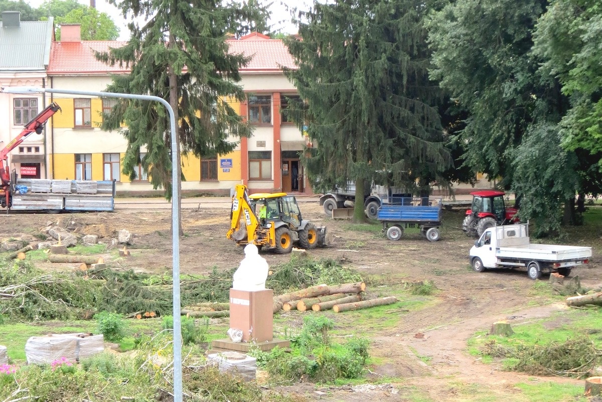 У місті Городок Львівської області під час реконструкції центральної площі перед ратушею зрізали всі дерева. Серед них були ялини, берези та інші породи.