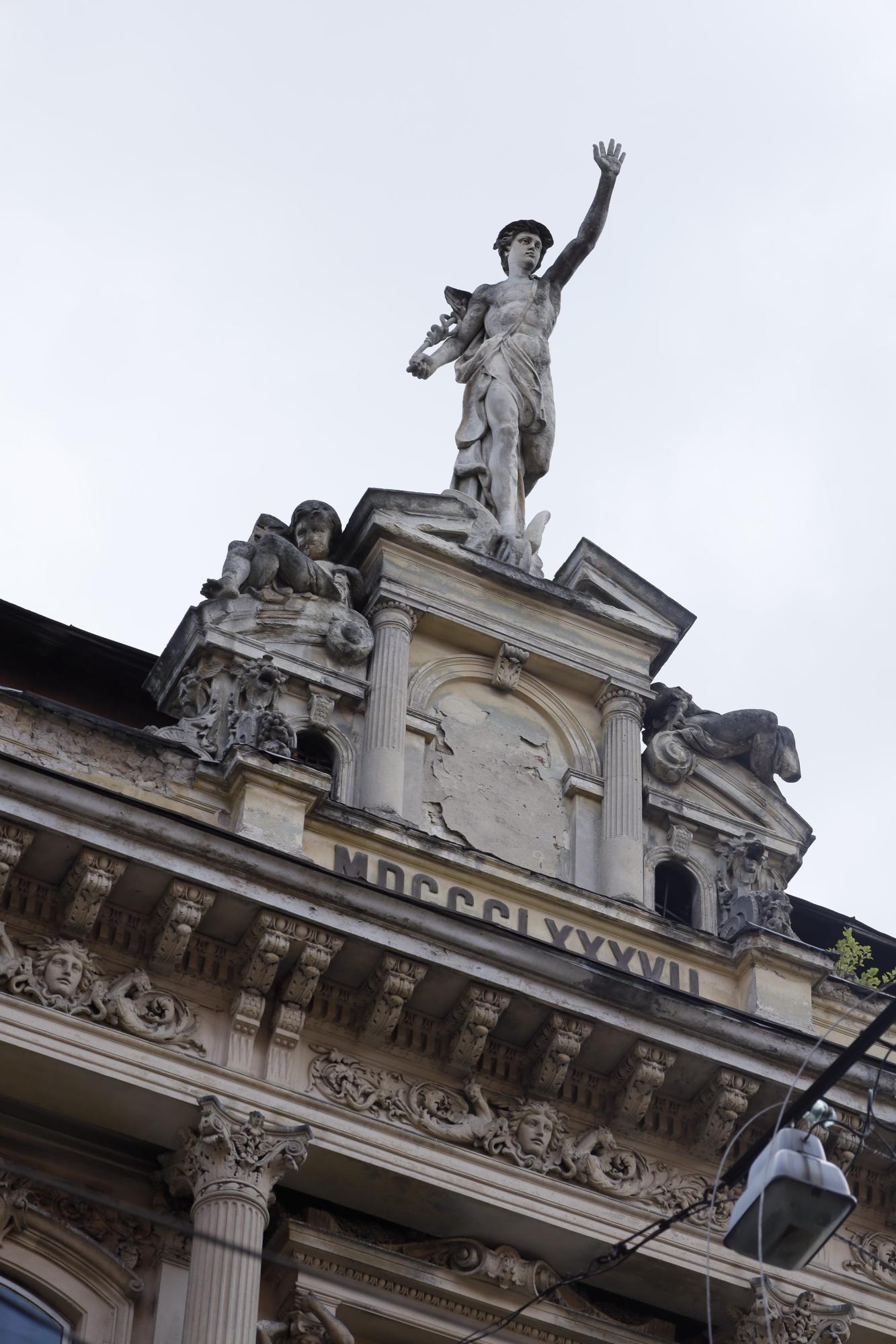 Будинок із Меркурієм зведений у 1887 році за проєктом архітектора Вінцента Равського. На фронтоні розміщено фігуру Меркурія авторства скульптора Леонардо Марконі. Колись там розміщувалася дирекція залізниці, а пізніше — готель «Імперіал».