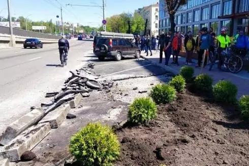 Під час акції кілька десятків учасників за допомогою будівельного спорядження повиймали бордюри та зняли асфальт з місця новоствореної парковки, де раніше був газон та велосипедна доріжка.