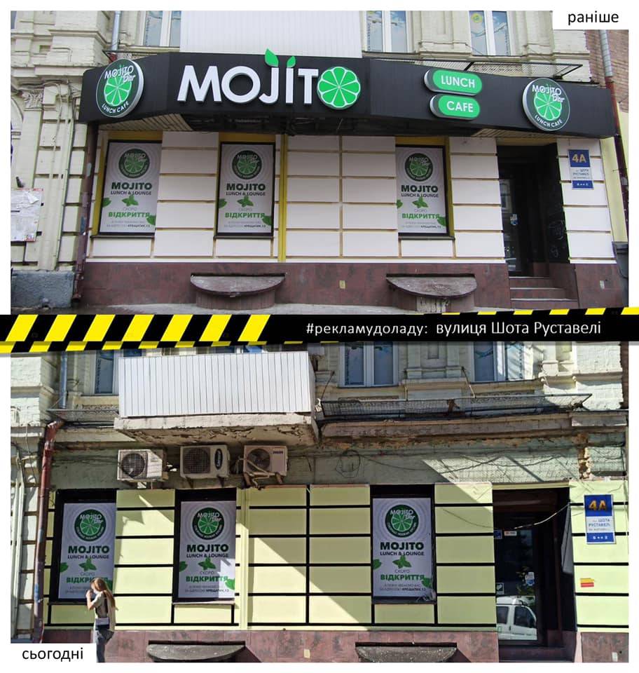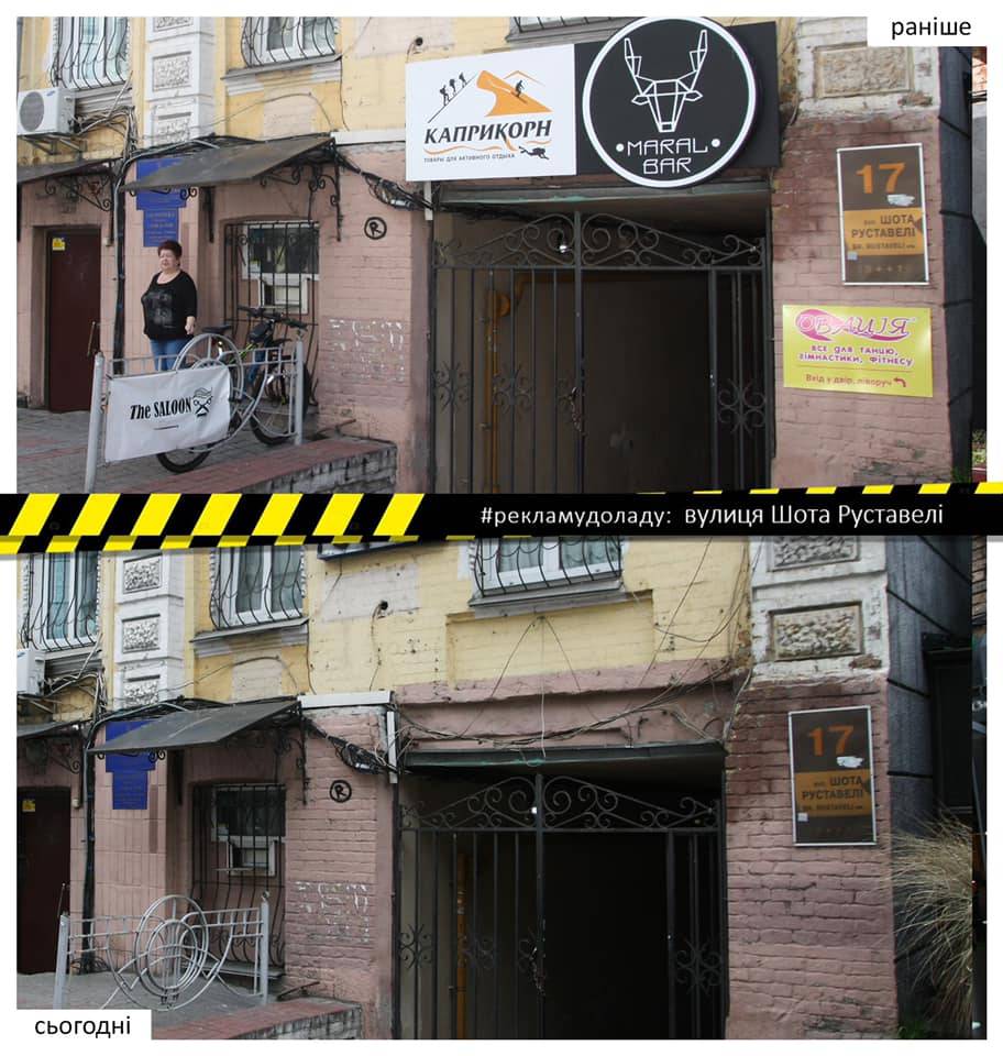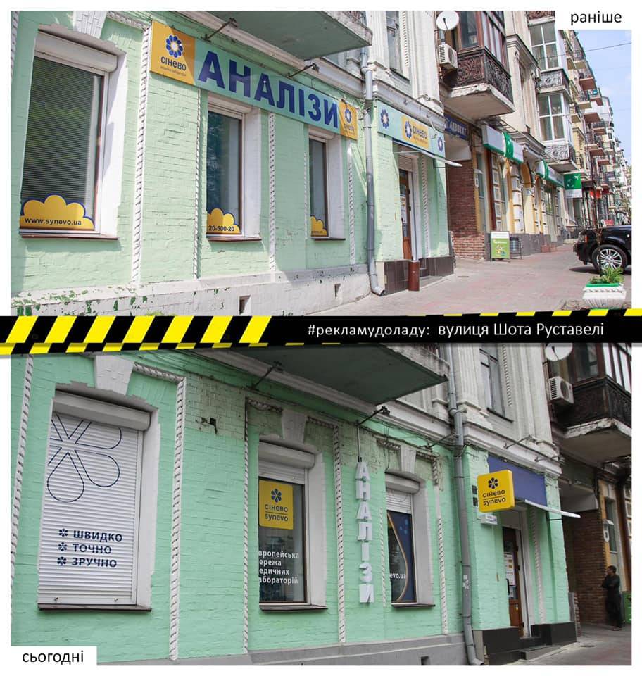 У центрі Києва демонтували рекламні вивіски з фасадів будинків на вулиці Шота Руставелі та бульварі Лесі Українки. Фотографіями на своїй сторінці в Facebook поділився Олександр Смирнов, начальник управління з питань реклами КМДА.
