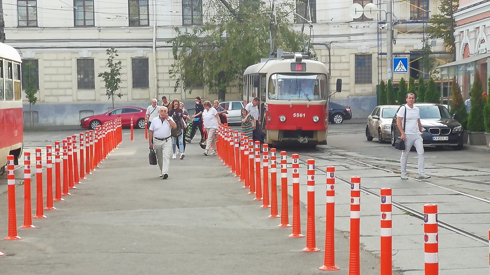 Фото. Біля зупинки трамваїв на Подолі встановили делініатори на місці стихійної парковки