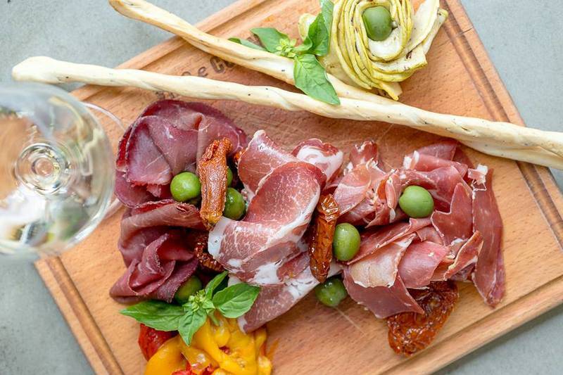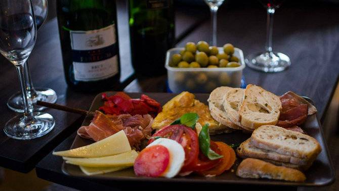 К вину предлагают мясные и сырные нарезки, вяленую дыню с цукатами и пряным сыром, багет с оливковым маслом, базиликом и специями, гриссини с оливковой пастой или муссом из рикотты.
