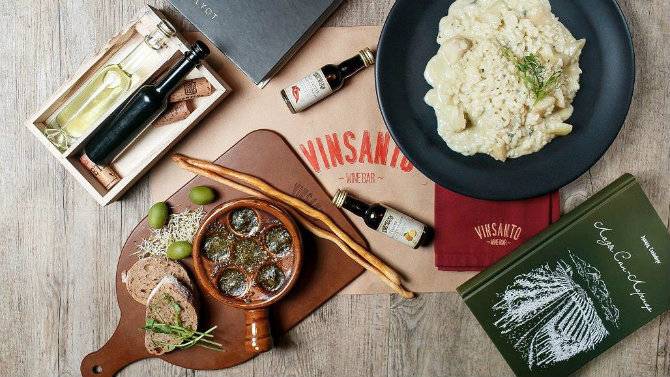 В меню кухни – закуски к вину, которые смогут выгодно подчеркнуть вкус напитков. Семь видов брускетт, сыры, улитки, мясо и колбасы, карпаччо и тар-тары, фрукты, оливки, вяленые томаты, паста и ризотто, стейки и морепродукты. Тем, кто не может определиться с выбором, помогут шеф-сомелье и бармены-официанты.