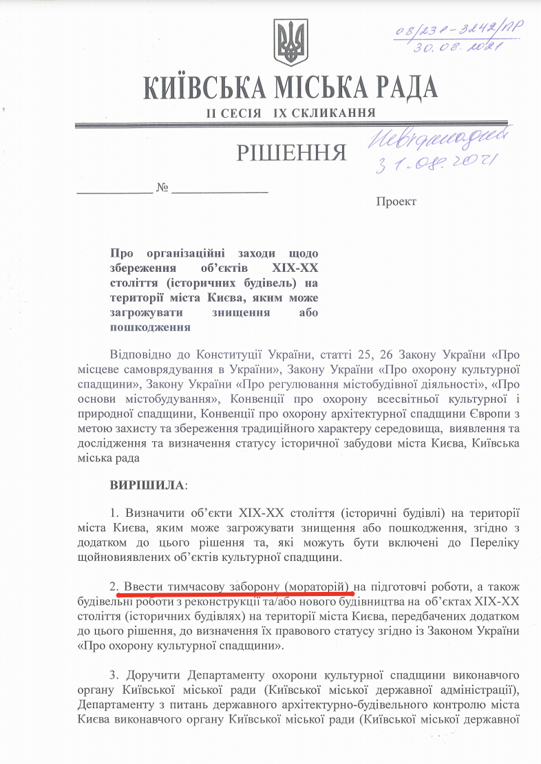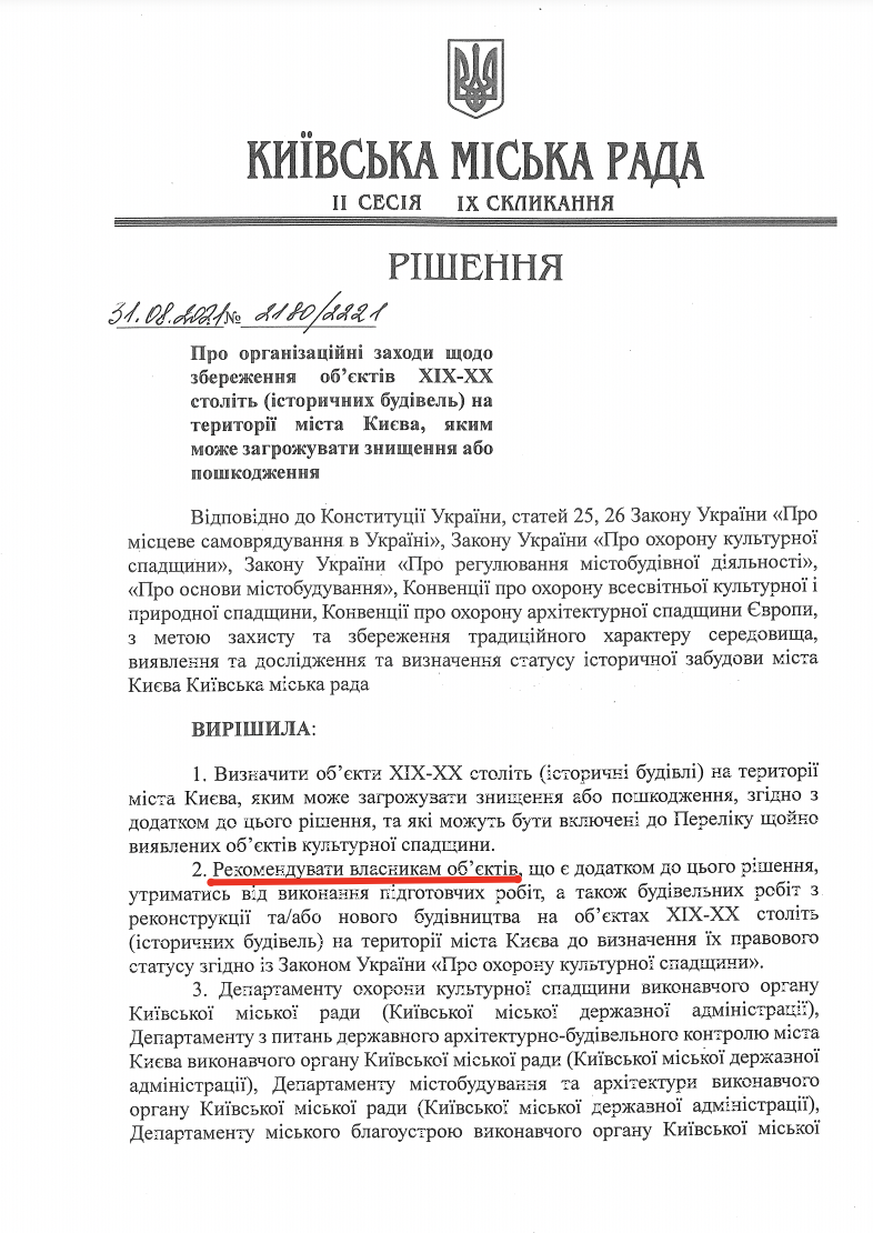 Початкова версія рішення, яку підтримала земельна комісія Київради, передбачала саме «тимчасову заборону (мораторій) на підготовчі роботи, а також будівельні роботи з реконструкції та/або нового будівництва на об’єктах ХІХ–XX століття». Проте в остаточному тексті документа, опублікованому на сайті Київради, забудовникам і власникам історичних будівель рекомендують «утриматись від виконання будь-яких підготовчих, а також будівельних робіт».