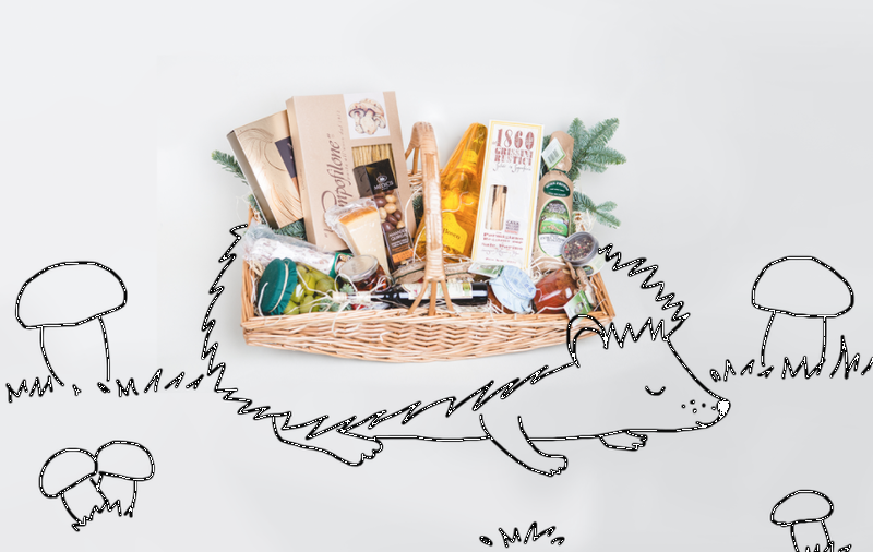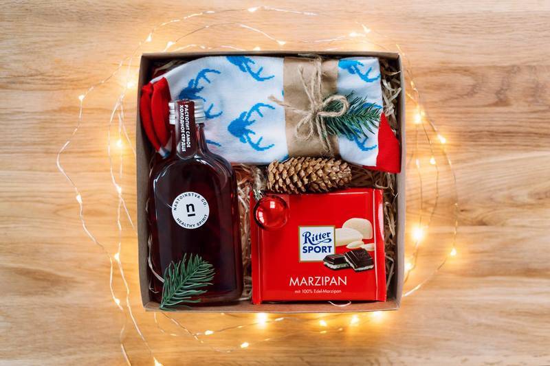 Пропонують кілька святкових наборів. Наприклад, з козячим сиром в італійських травах, варенням із соснових шишок, сушеною ковбасою з блакитним сиром, грісіні, пастою песто й ігристим вином Lambrusco Italia. А в іншій коробочці – настоянка зі смаком малини, м'яти та гострого перцю, шоколад Ritter Sport з марципаном, плюс – кумедні святкові шкарпетки й вітальна листівка.