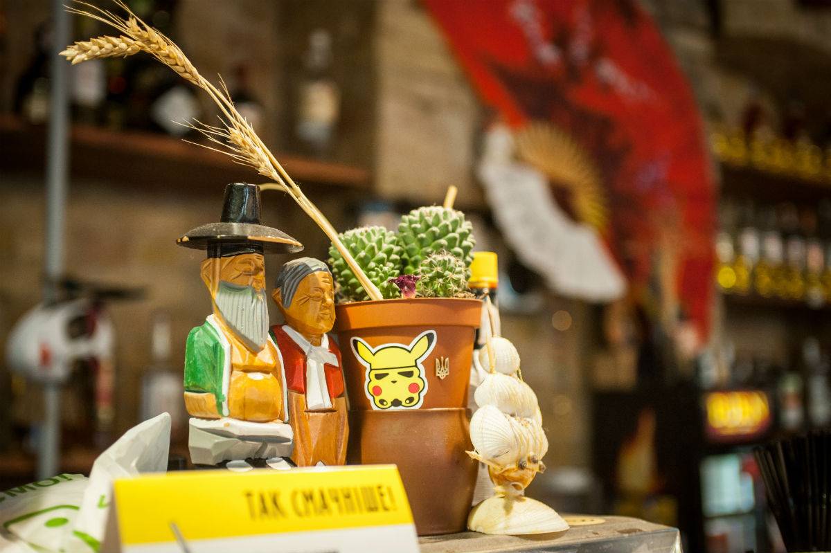 Дизайн закладу Ілля і команда вигадували самі, а декор збирали звідусіль — віяло, яке висить на стіні, знайшли в під'їзді, ваги приніс колишній шеф-кухар, парасольку привезла з Китаю підписниця Іллі на Facebook, яка працює в китайському посольстві.Єдине, що замовили професійному дизайнеру — принт для барної стійки.