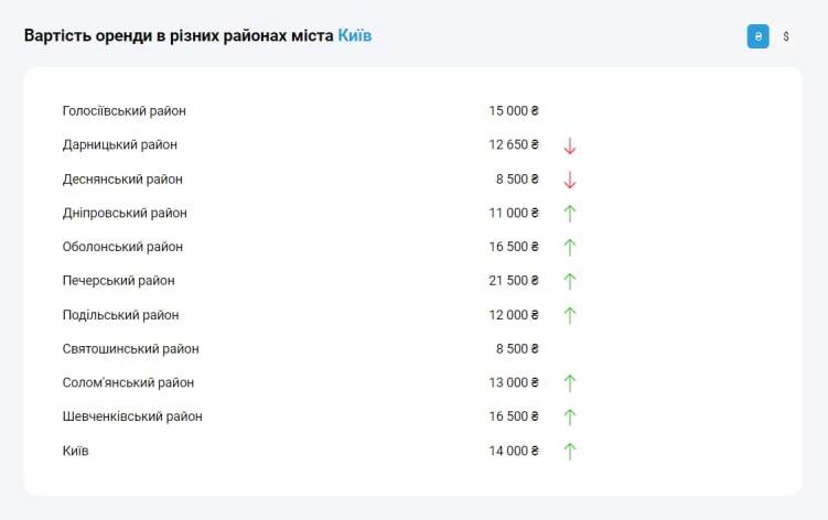 Найдорожча оренда у Печерському районі – в середньому 21 000 грн. Найдешевше – у Деснянському та Святошинському районах – 8 500 грн.