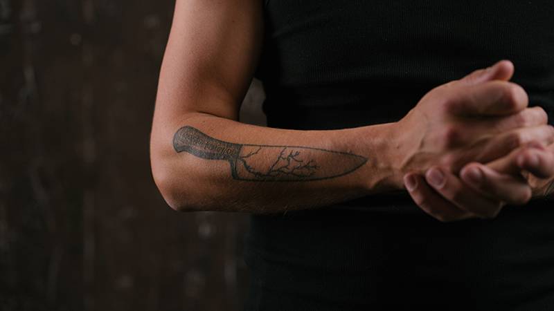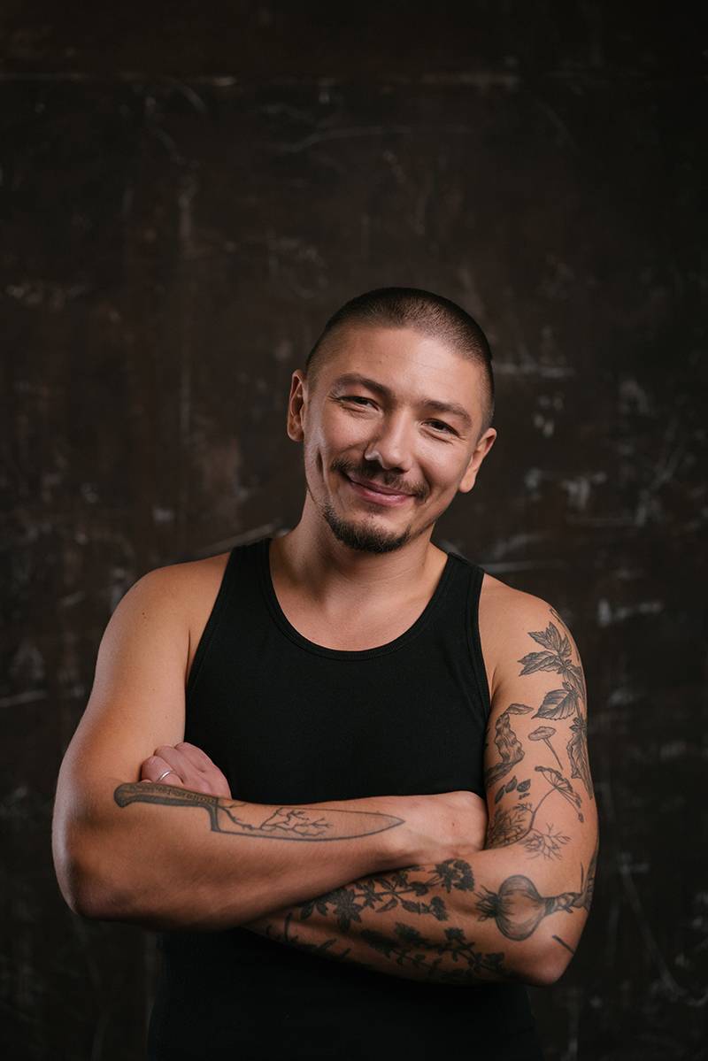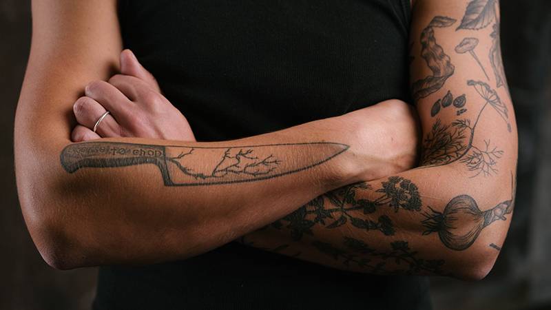 В Америке, когда я только пришел работать в один из ресторанов, меня поставили на досточку делать заготовки. Это был Hi-end стейк-хаус. Я 8 часов не отходил от доски, просто стоял и резал, потому что делал это лучше и быстрее всех. И когда я уходил из этого ресторана, то пообещал ребятам, что набью нож на руке с надписью “Лицензия на нарезку”. Хочу еще на этой руке мясорубку и терку.