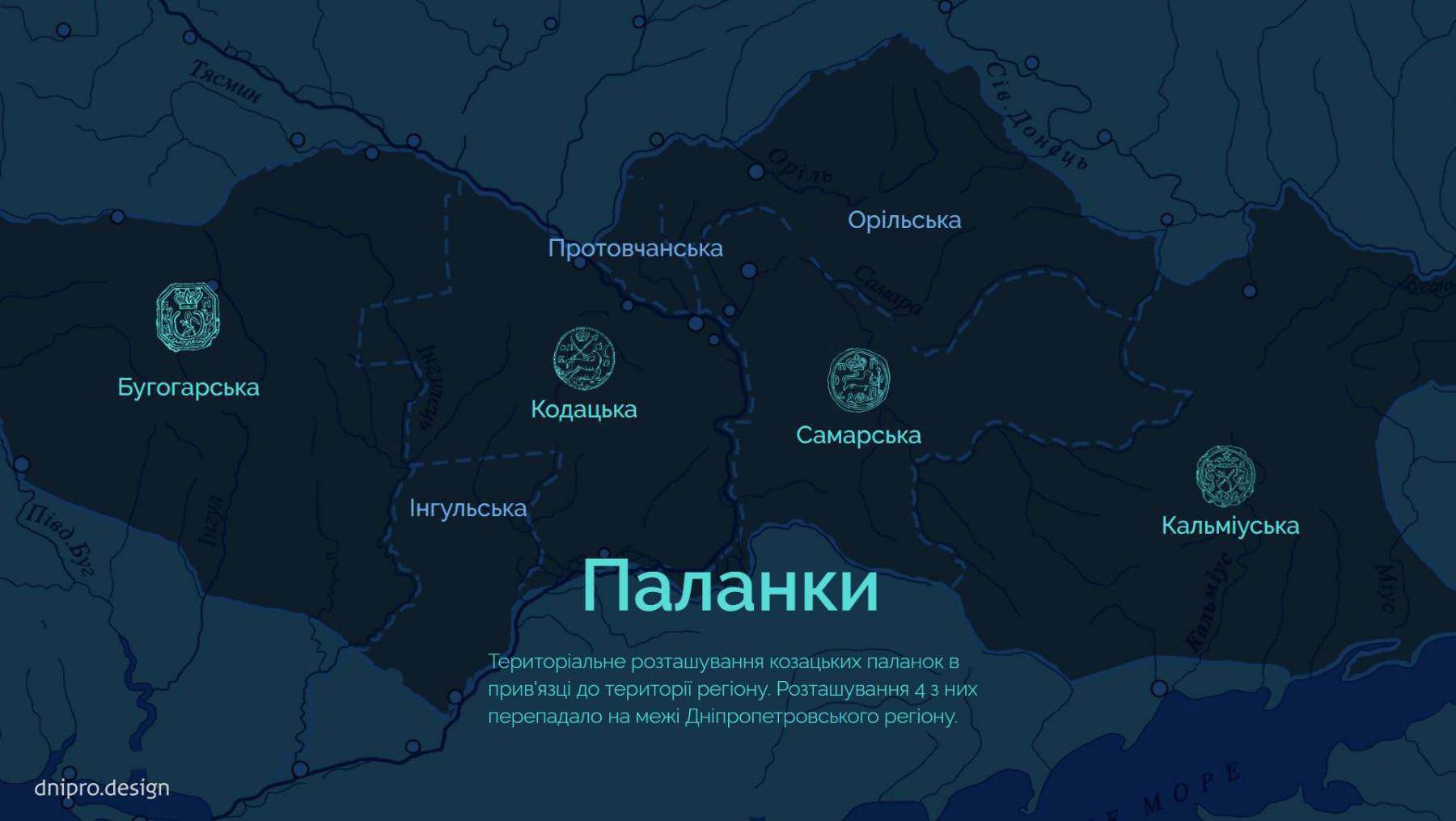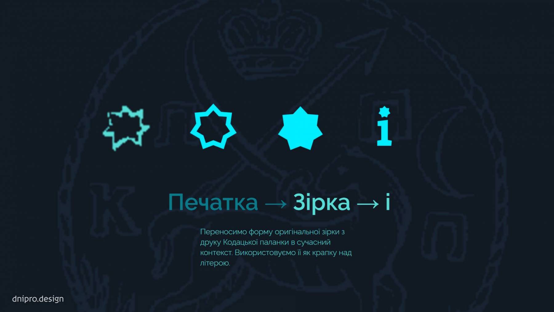 Графічна композиція – пряма спадкоємність печаток козацьких паланок, більшість яких знаходилися на території саме Дніпропетровської області. Об'єднувальний елемент, присутній на всіх козацьких печатках – семикутна зірка, яка увінчала букву «і».