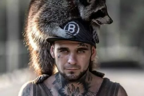 Марлі – дуже розумний єнот. Коли я взуваюся, він сам вилазить мені на плече. Єноти не терплять самотності, тому я постійно його вигулюю. Майже завжди ходжу з ним без повідця, надягаю тільки, коли він ходить по землі – щоб не нарватися на великих собак.