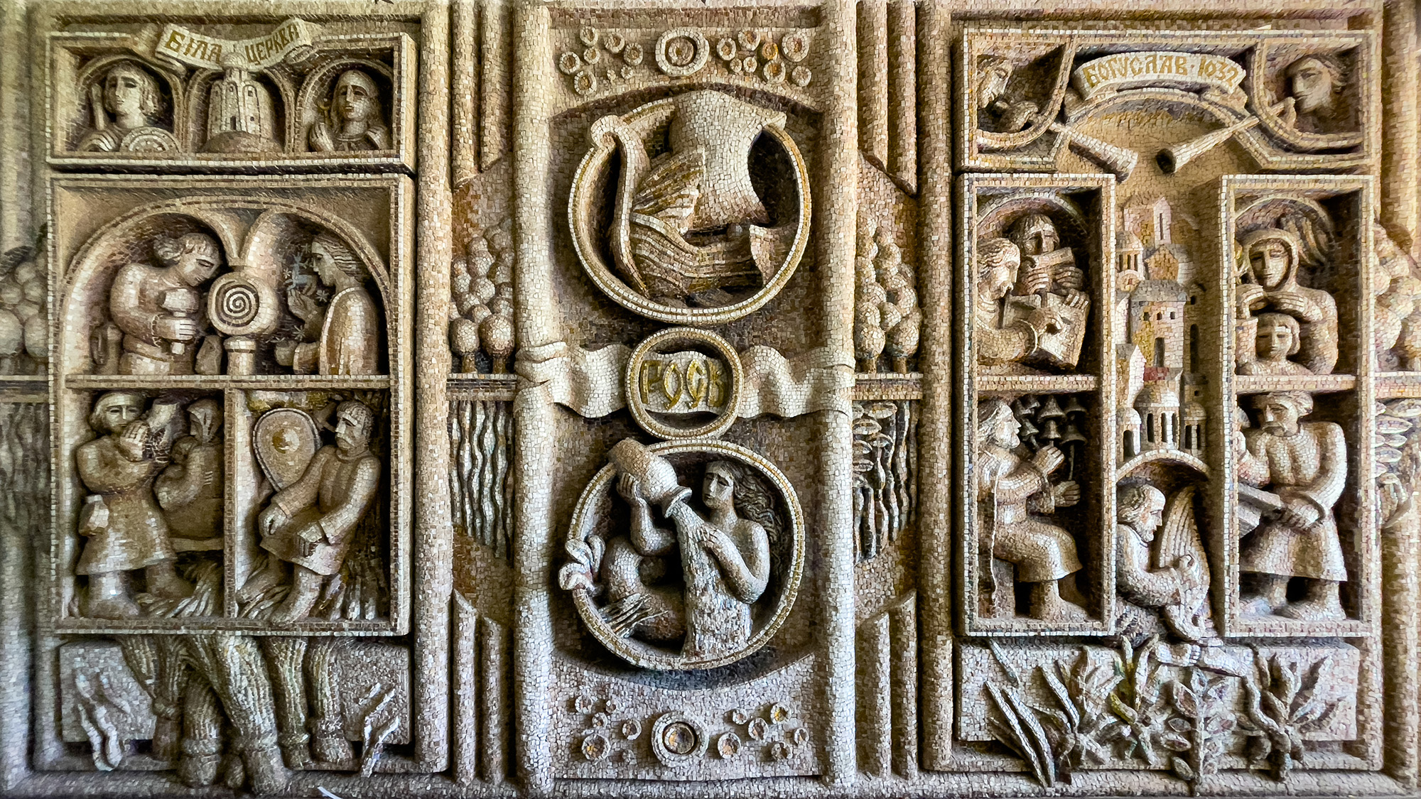 Мозаїчні твори Алли Горської — рок-зірки нашого монументального мистецтва — вражають своєю декоративністю й яскравою енергією. Мозаїки, картони й ескізи вона опрацьовувала власноруч із великою любов’ю. Перш ніж занурити камінчик у розчин, довго його розглядала з усіх боків. І це мало дивовижний ефект: навіть однакові за кольором камінці починали грати різними відтінками.