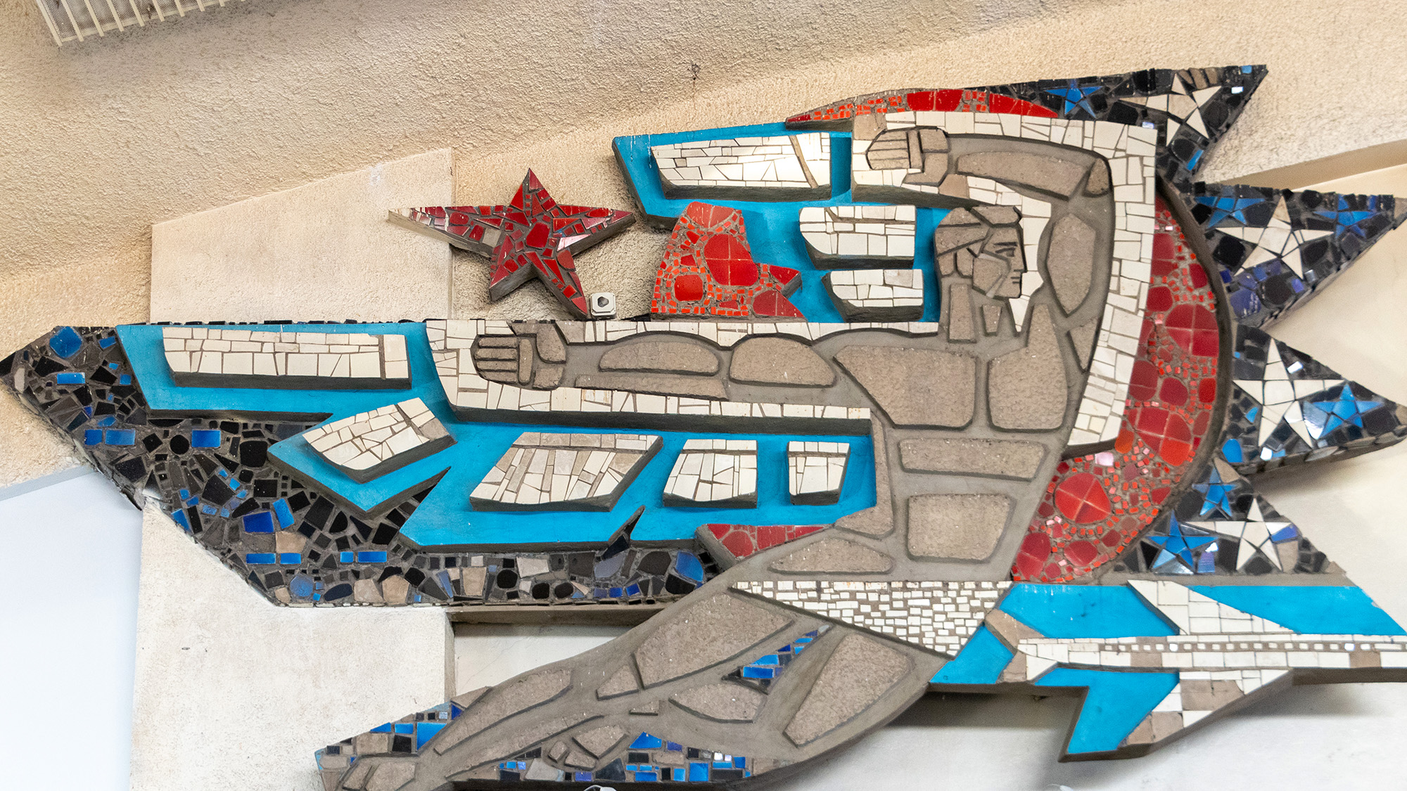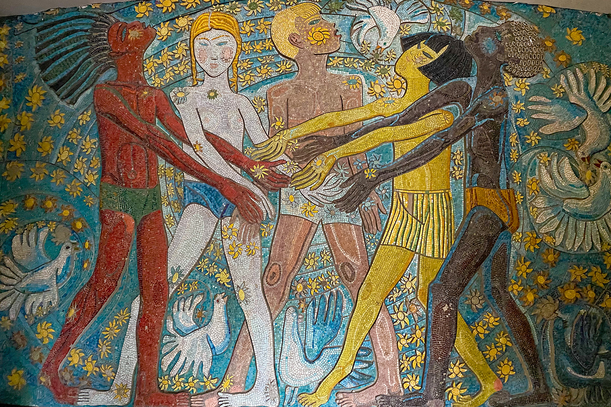 У холі центрального входу художники теж відійшли від стандартів — створили мозаїчне панно на тему «дружать діти всього світу», але замість шаблонної трійки дітей з Європи, Африки та Азії у червоних краватках, свідомо додали індіанця та дівчинку з півночі. Така подача спричинила чимало запитань у комісії, що приймала роботу: де червоні краватки, чому їх п’ятеро і чому вони роздягнені? Але роботу вдалося відстояти.