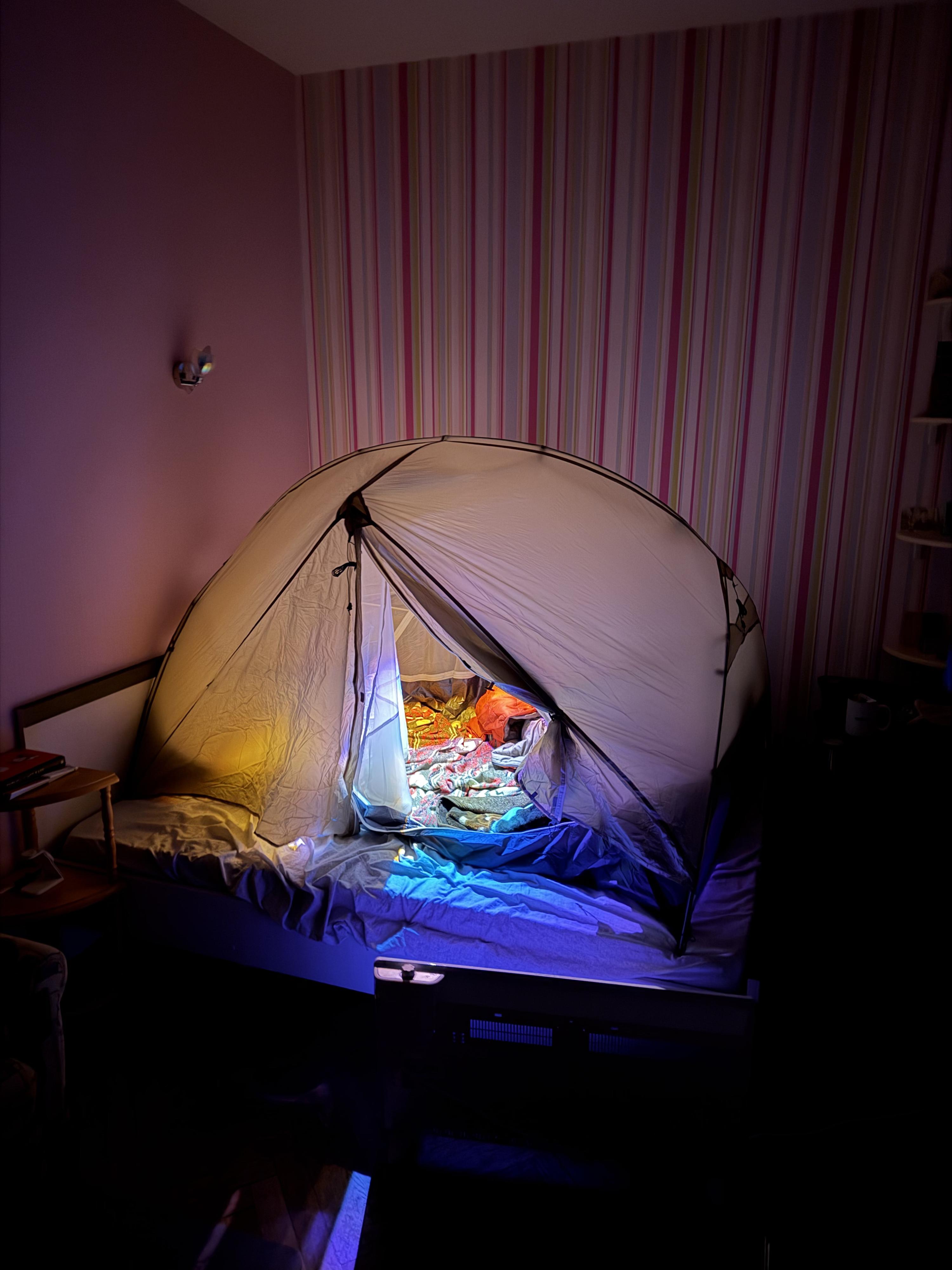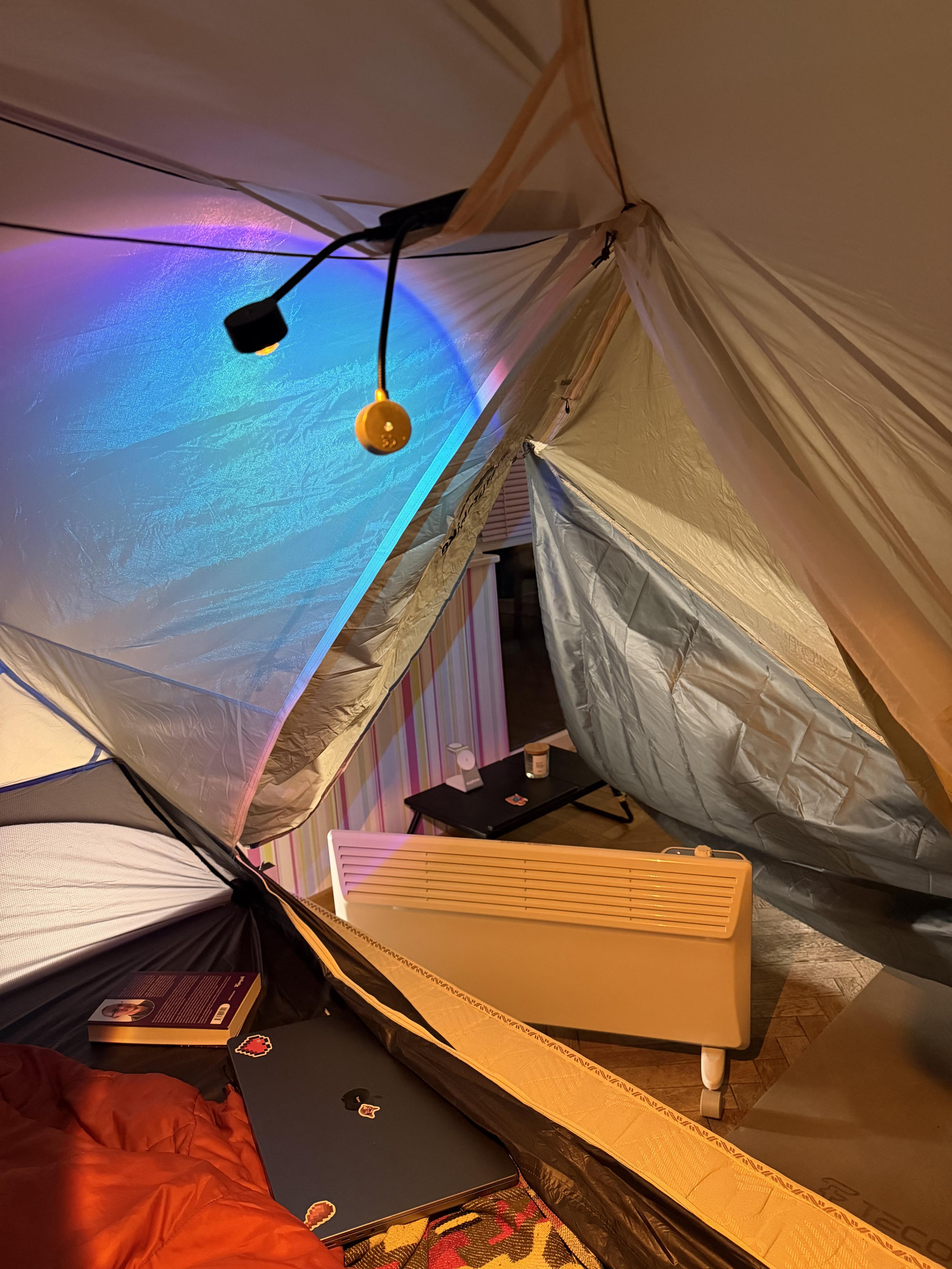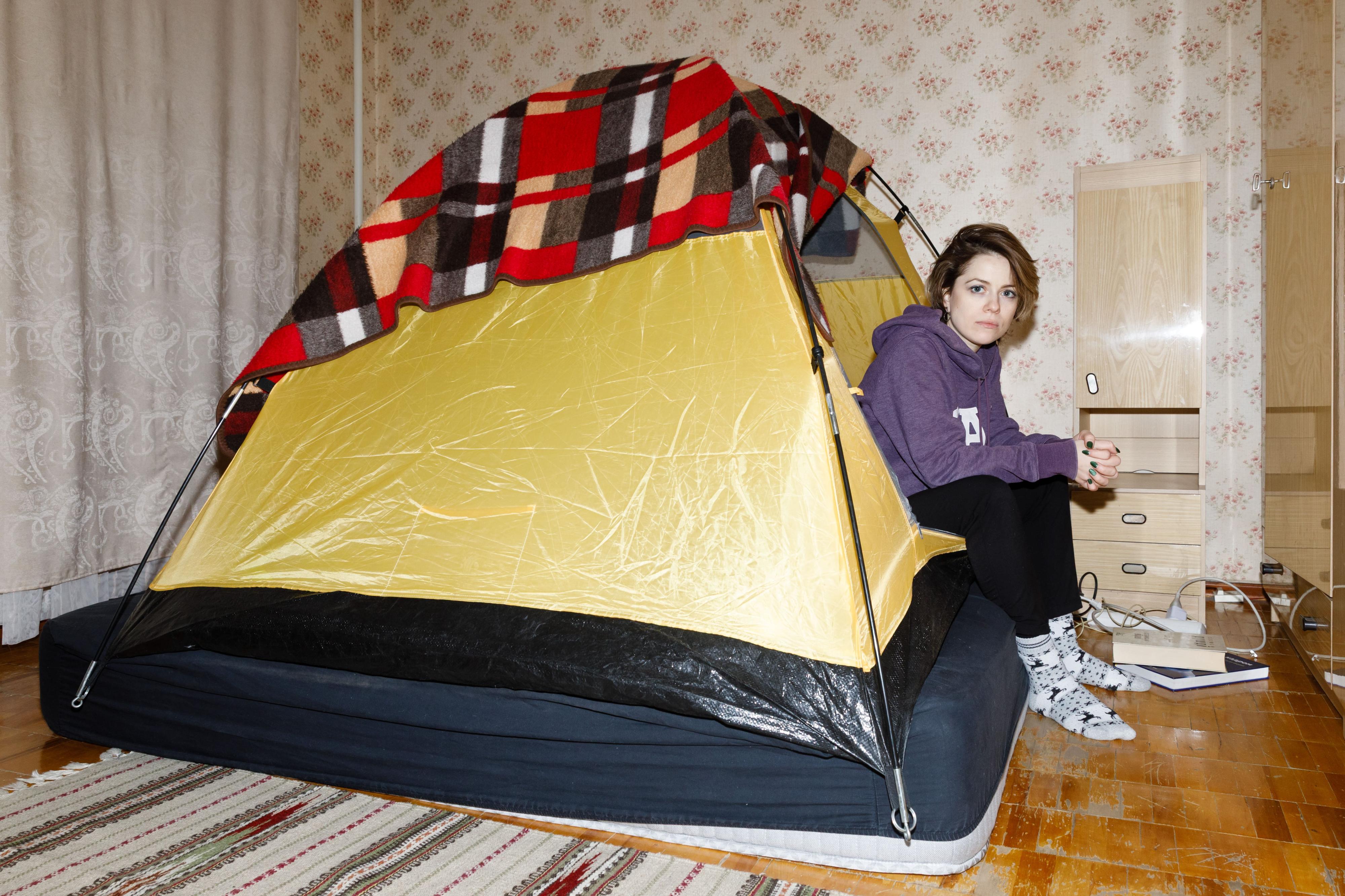 Я «замерзлюха», погано переношу холод. Думала, якщо опалення відключать — переїду до друзів в інші райони. Світло й вода — не так страшно, а опалення — це база в моїй піраміді потреб. Але мої адаптивні навички мене здивували. Виявилося, що жити можна. Спершу я дістала спальник і ночувала у ньому. Потім згадала про батьківський намет у коморі. Поставила його в кімнаті, щоб створити «простір у просторі». Почала жити й спати в наметі.