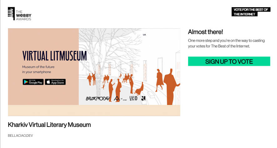Онлайн-платформа “Віртуальний ЛітМузей” від Харківського літературного музею потрапила у пʼятірку найкращих в світі застосунків у категорії «Додатки, децентралізовані додатки та програмне забезпечення – мистецтво, культура та події» (Apps, dApps and Software – Art, Culture, and Events). Проголосувати можна тут.