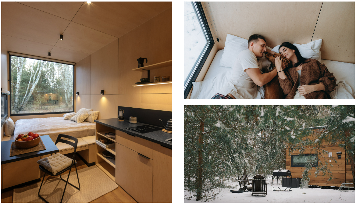 Кебіни мають велике ліжко, санвузол та кухню. Вони такі ж комфортні, як і стаціонарні котеджі УЛІС, до яких гості вже звикли. Особливого затишку тут додає панорамне вікно, завдяки якому відчувається близькість до природи. Тож такий формат ідеально підходить для пар або самостійних поїздок, щоб підзарядитися та відновитися.