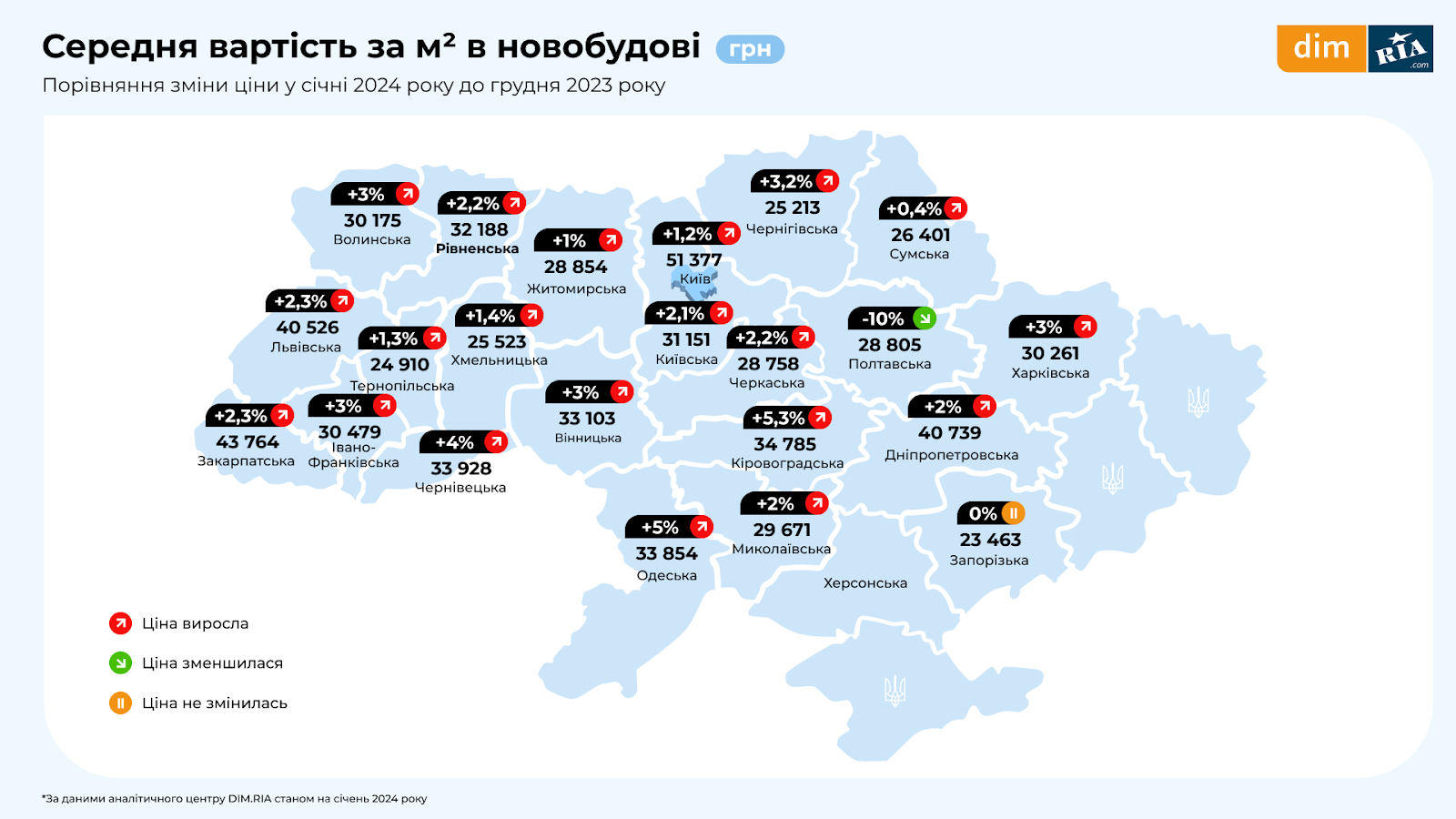 Станом на січень 2024 року найвища середня вартість за м² у столиці і складає 51 377 грн, враховуючи всі типи квартир за кількістю кімнат. За місяць ціна за м² зменшилася у Полтавській області, проте у Кіровоградській та Одеській областях збільшилася на 5%.