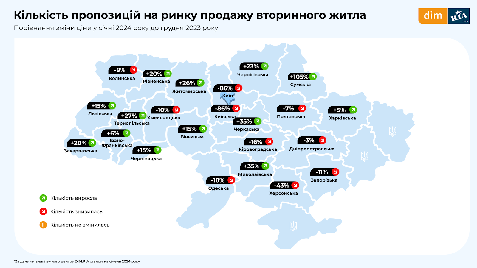 У Києві пропозиція зменшилася на 13% порівняно з груднем 2023 року. В Івано-Франківськівській області кількість оголошень збільшилася на