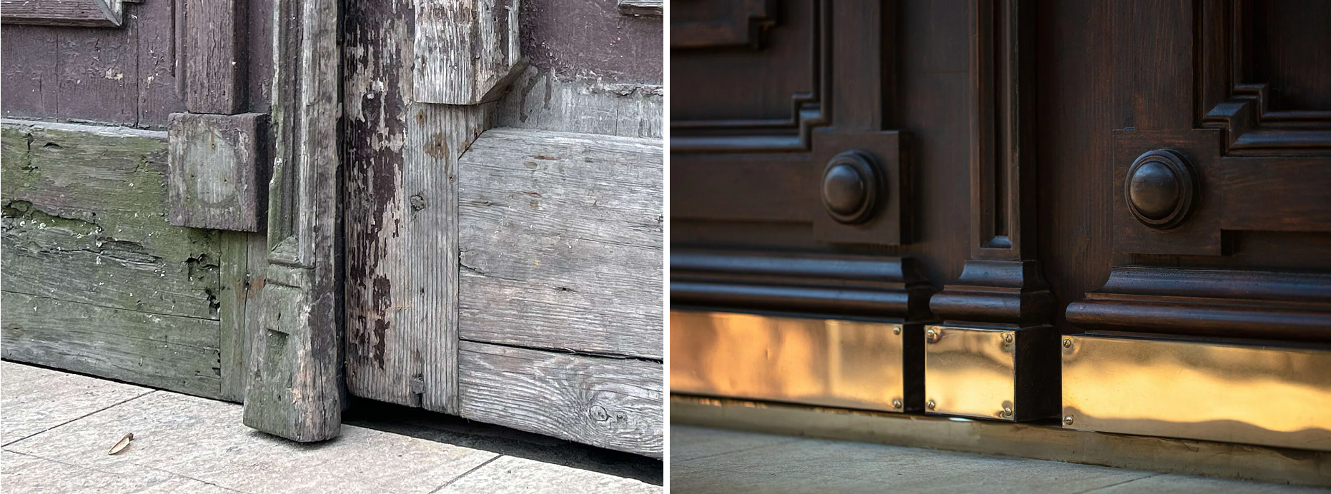 А латунні пластини, прикріплені на підбори, тепер служать практичній меті — захищають підставу дверей від вологи та фізичного впливу.