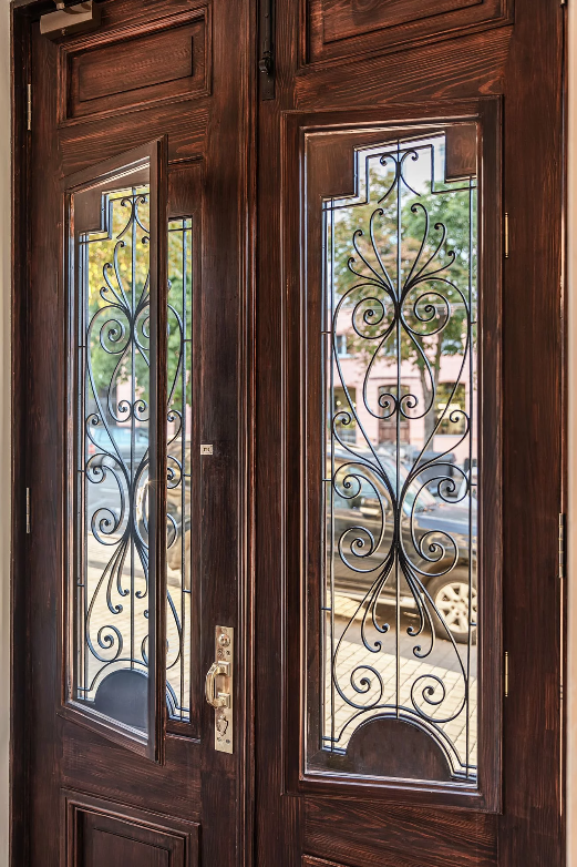 Крім цього, відтворена стулкова планка в центрі дверей та її декоративні елементи — гармонійно закінчують композицію, охороняючи під'їзд і зберігаючи температуру приміщення.