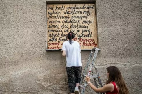 На зовнішніх вікнах Діна Чмуж написала чеською мовою вірші українських поетів Максима Кривцова та Вікторії Амеліної. До текстів художниця додала примітку про те, що вони загинули через російсько-українську війну.