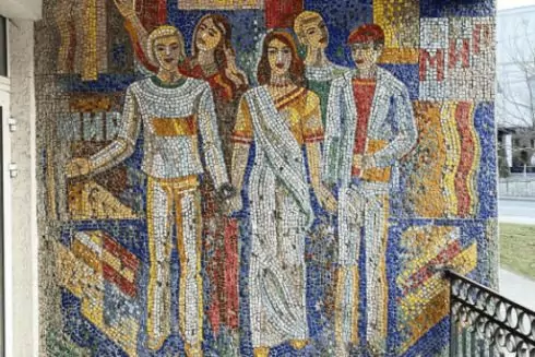 На мозаїці були зображені студенти в різних національних вбраннях, адже будівля розташована в районі Вінницького медичного університету (вулиця Івана Дзюби).