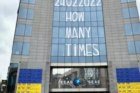 Харківський художник Гамлет Зіньківський у Брюсселі на будівлі Міністерства закордонних справ до третьої річниці повномасштабної війни створив стритарт під назвою How many times.