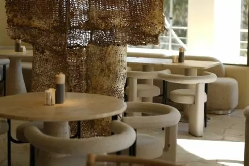 Інтер'єр виконано у пастельних відтінках, що підкреслюють текстильні інсталяції. У закладі використовували меблі українських виробників, зокрема noome home та Woo furniture. Унікальні світильники, натхненні гуцульською трембітою, розробив дизайнер Валерій Кузнєцов. Підлога викладена природним каменем травертином з українських копалень.