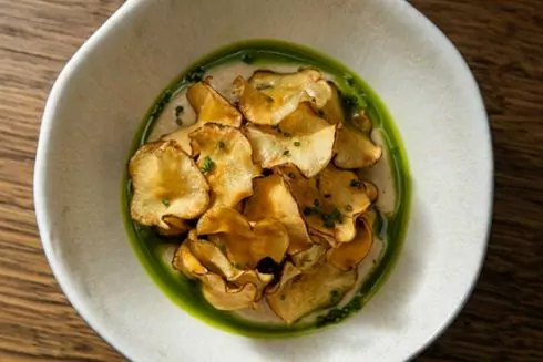 - тартар з яловичини із соусом з білих грибів, чипсами з топінамбура та олією з любистку;
