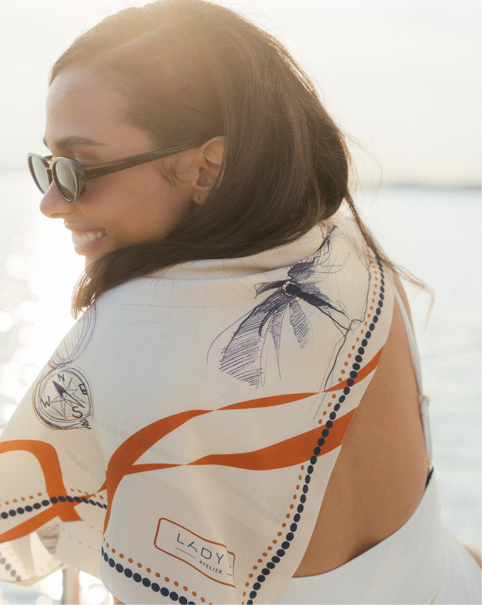 У центрі колекції — шовкові хустини з принтами “Теура” та “Безмежність”, в яких закладені символи творчості та мандрів Яблонської. Назва хустини “Теура” відсилає до імені героїні книги “Далекі обрії” — таїтянки, яку Софія описувала з великою симпатією та ніжністю.